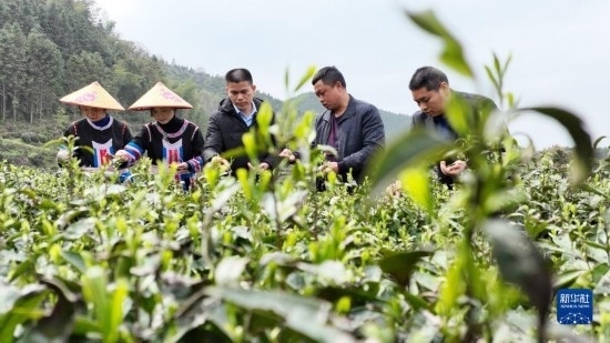 3月20日,在湖南衡陽常寧市塔山瑤族鄉(xiāng),技術(shù)人員在茶園指導(dǎo)茶農(nóng)采茶(無人機照片)。