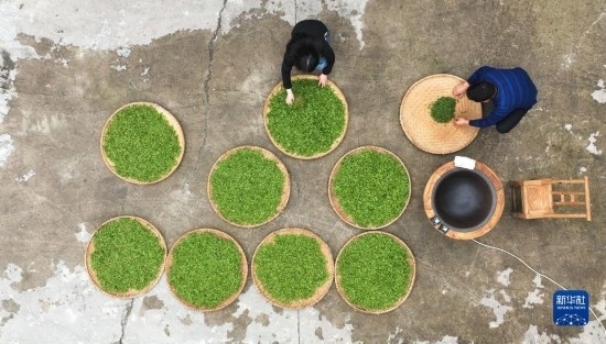 3月20日,在湖南衡陽常寧市塔山瑤族鄉(xiāng),茶農(nóng)在炒茶(無人機照片)。