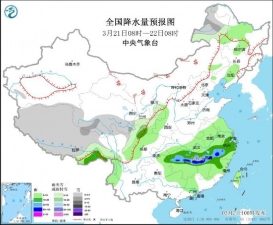 3月21日08時至22日08時,內(nèi)蒙古東北部、西藏大部、青海南部、甘肅東南部等地部分地區(qū)有小到中雪。西藏東南部、江南中北部等地部分地區(qū)有中到大雨,其中,湖南中西部、江西中北部等地部分地區(qū)有暴雨或大暴雨(100~120毫米)。內(nèi)蒙古中部、西北地區(qū)中部等地部分地區(qū)有4~6級風,其中,內(nèi)蒙古西北部部分地區(qū)有6~7級風,并伴有沙塵天氣。