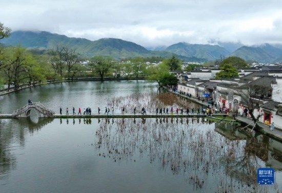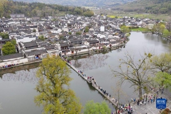 3月24日,游客在黟縣宏村南湖游覽(無(wú)人機(jī)照片)。