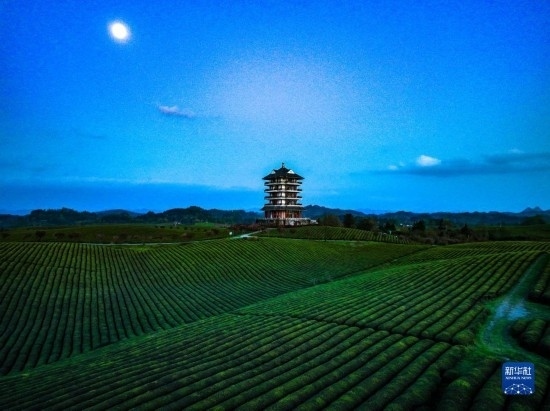 4月4日在遵義市湄潭縣永興鎮(zhèn)拍攝的月光下的“萬畝茶?!保o人機(jī)照片)。