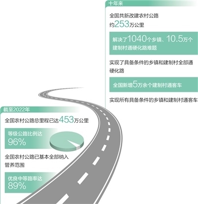 一條條“四好農(nóng)村路”修到村頭,通到了鄉(xiāng)親們的家門(mén)口。截至2022年,全國(guó)農(nóng)村公路總里程已達(dá)453萬(wàn)公里,等級(jí)公路比例達(dá)96%。十年來(lái),我國(guó)支持貧困地區(qū)新改建了6.5萬(wàn)公里資源路、旅游路、產(chǎn)業(yè)路。