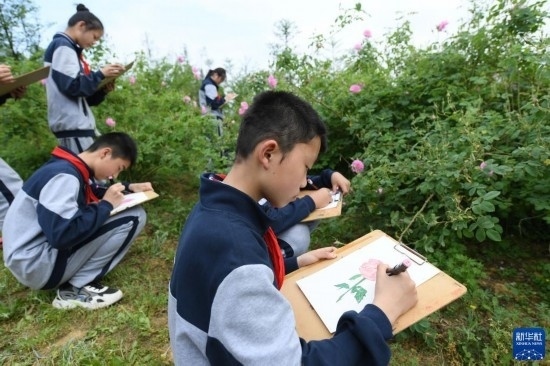 4月20日,埭溪鎮(zhèn)上強中學的學生在玫瑰莊園寫生。