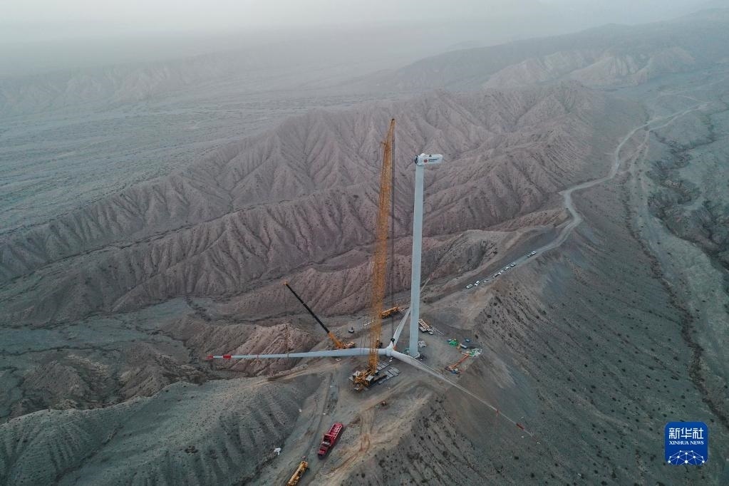 在新疆克孜勒蘇柯爾克孜自治州烏恰縣,風(fēng)機(jī)葉輪提升至相應(yīng)高度后與機(jī)艙對接(4月21日攝)。