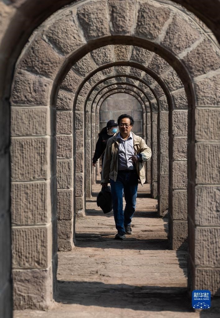4月25日,人們?cè)跒o縣奇峰鎮(zhèn)的勝利渡槽下層行走。跨越龍溪河的勝利渡槽分上下兩層,上層通水,下層為人行通道,非常獨(dú)特。