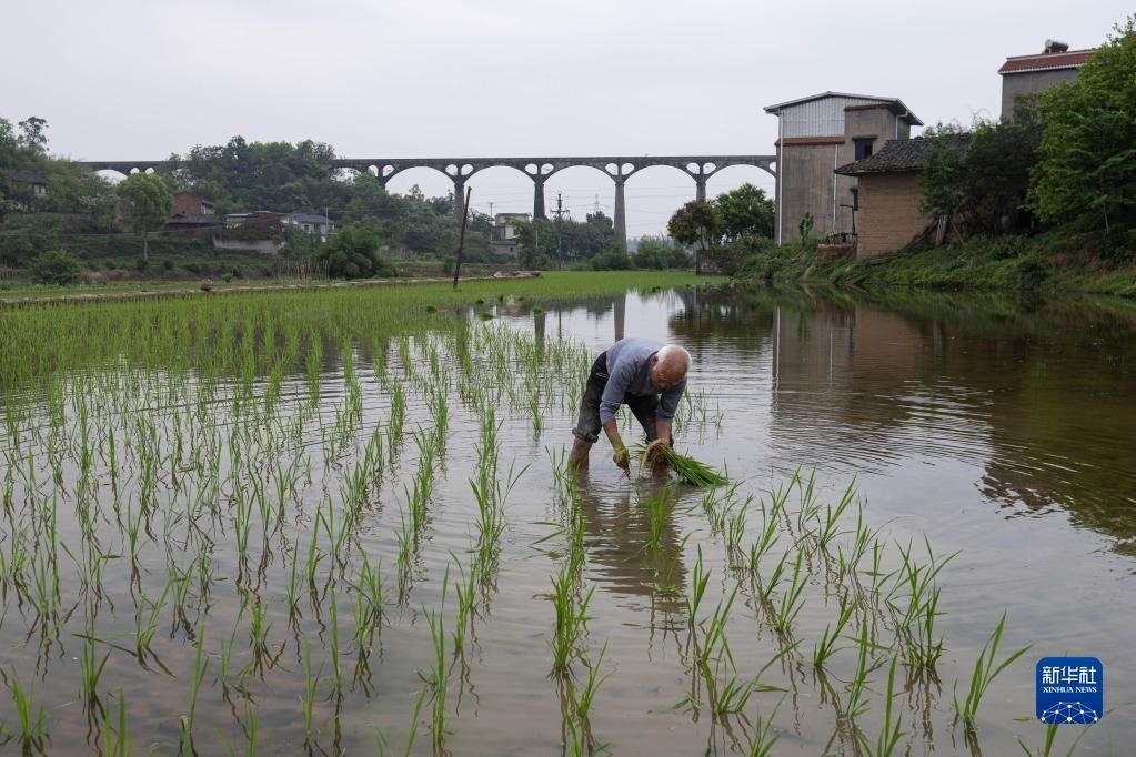 4月25日,在瀘縣奇峰鎮(zhèn)陽(yáng)高村,村民在勝利渡槽附近的水田里插秧。