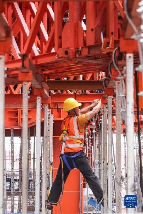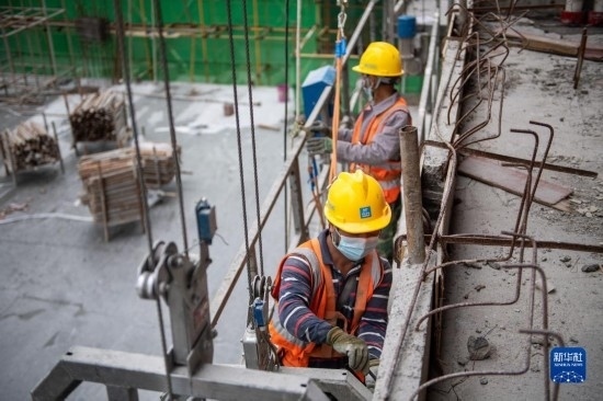 5月3日,中建三局的工人在海南中心項(xiàng)目的“空中造樓機(jī)”內(nèi)施工。