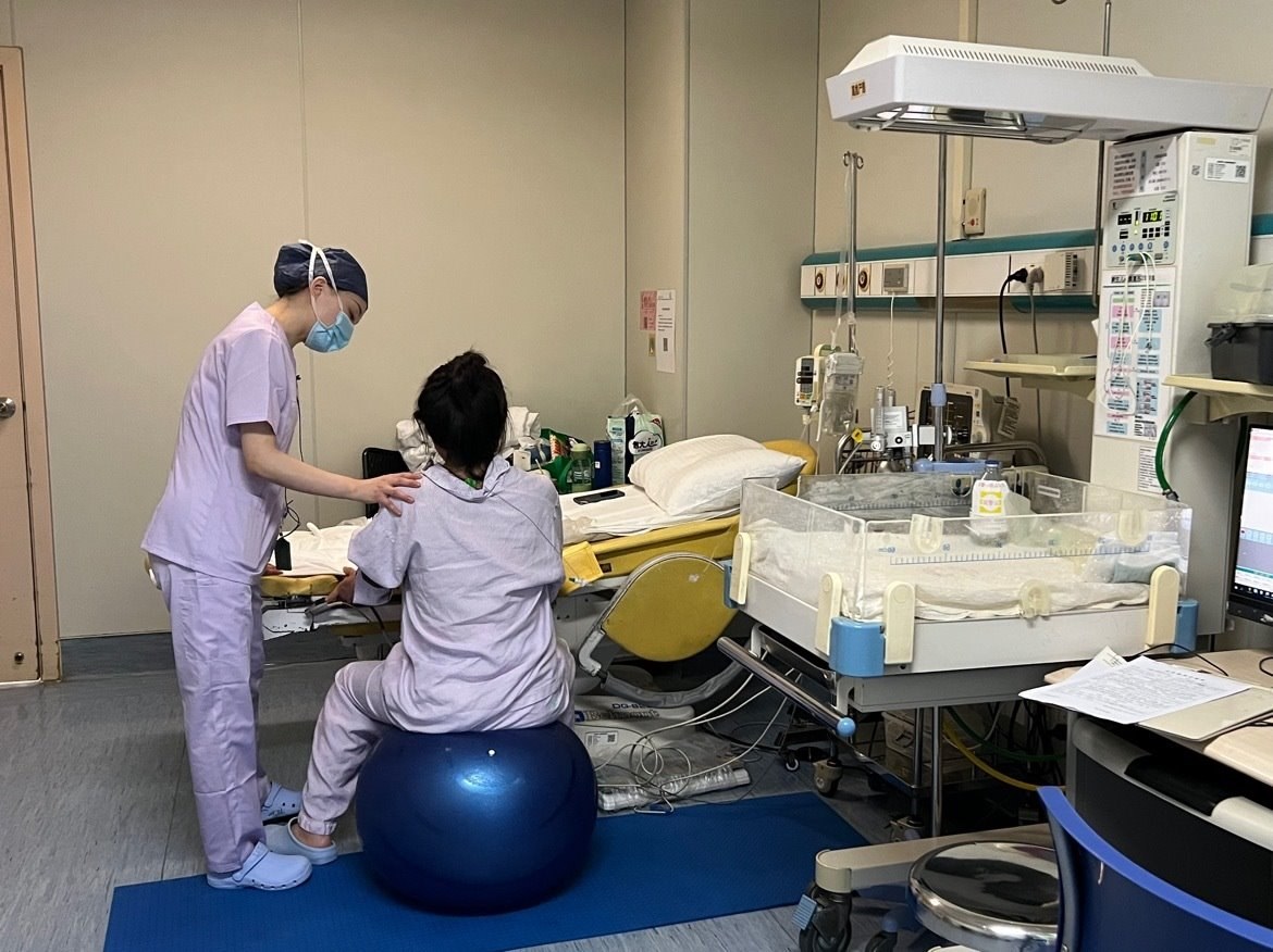 助產(chǎn)士吳靜正幫助一名出現(xiàn)宮縮的孕產(chǎn)婦再瑜伽球上運動。