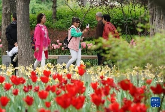 近日,山西省太原市迎澤公園內(nèi)各色郁金香競(jìng)相綻放,吸引游人前來(lái)觀花賞景。