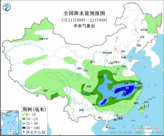 5月21日08時至22日08時,陜西中部、黃淮西部、江淮西部、江漢、江南大部、西南地區(qū)東部等地部分地區(qū)有中到大雨,其中,安徽南部、湖北東南部、湖南東北部和西部、江西北部、浙江中北部、貴州東南部等地部分地區(qū)有暴雨(50~90毫米)。內(nèi)蒙古、東北地區(qū)、黃淮、江漢、江南北部等地部分地區(qū)有4~6級風(fēng)。