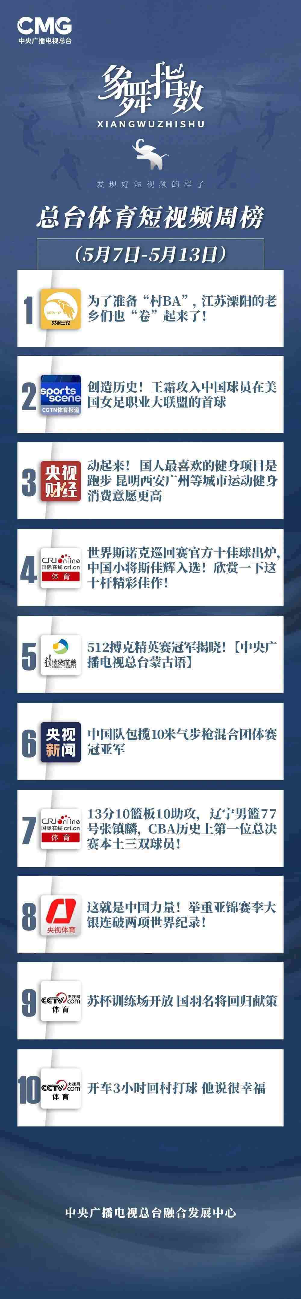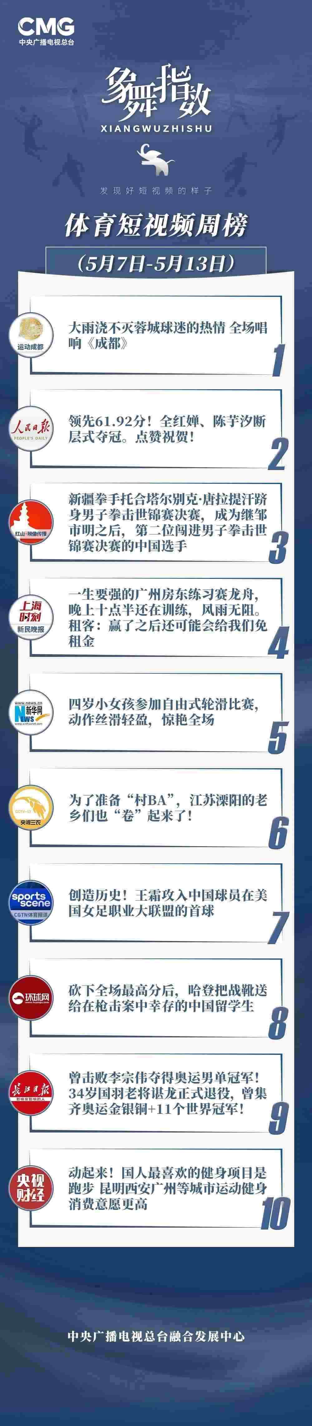 中央廣播電視總臺(tái)“象舞指數(shù)”評議品牌,推出體育短視頻周榜、總臺(tái)體育短視頻周榜。在5月7日—5月13日,以下內(nèi)容獲得矚目: