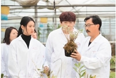 萊蕪職業(yè)技術學院教授王鋒祥(右)在進行鐵皮石斛種植技術指導。周美棟攝