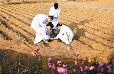萊蕪職業(yè)技術學院師生在萊蕪區(qū)苗山鎮(zhèn)田家樓村的白花丹參種植基地查看種苗情況。趙樹宴攝