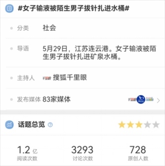 據(jù)微信號“網(wǎng)信連云港”6月1日消息,近日,一條涉連云港“女子輸液被陌生男子拔針扎進水桶”的新聞,引發(fā)多家媒體轉(zhuǎn)載報道,相關話題沖上各大平臺熱榜。