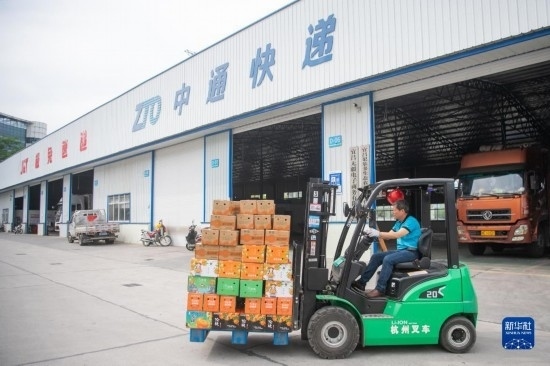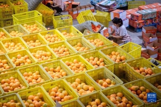 6月8日,在秭歸縣華維電商物流園區(qū)內(nèi),工作人員運輸即將發(fā)貨的臍橙。