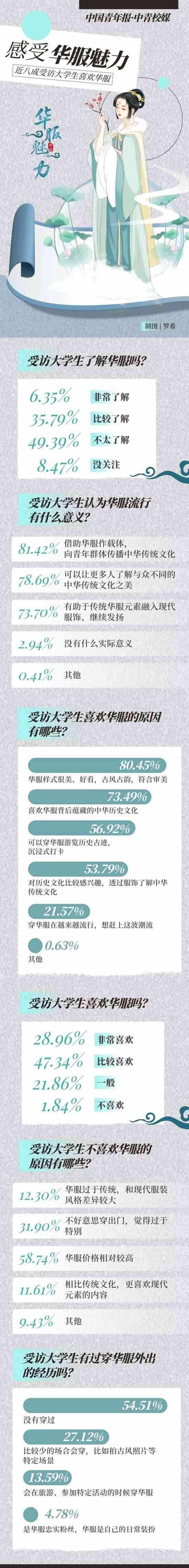 穿華服正在成為一些年輕人旅游或日常出行的選擇。“華服”,是指具有中華民族歷史文化基因、精神風貌,且融合當代審美的禮儀性服裝,其服裝風格根植于中華傳統(tǒng)文化,傳承中華民族特質(zhì),體現(xiàn)當代社會積極向上的時代精神,具有鮮明的辨識度,適用于國際交往、文化交流、商貿(mào)往來以及日常節(jié)慶、典祭等禮儀場合。自2018年起,每年的農(nóng)歷三月初三被選定為“中國華服日”,在前不久結(jié)束的第五屆“中國華服日”活動中,上萬名青年華服愛好者匯聚活動現(xiàn)場參與體驗。近日,中國青年報社·中青校媒面向全國高校大學生發(fā)起問卷調(diào)查,共回收117所高校學生填寫的有效問卷1464份。調(diào)查結(jié)果顯示,76.30%受訪者表示喜歡華服,42.14%受訪者表示對華服有一定的了解。