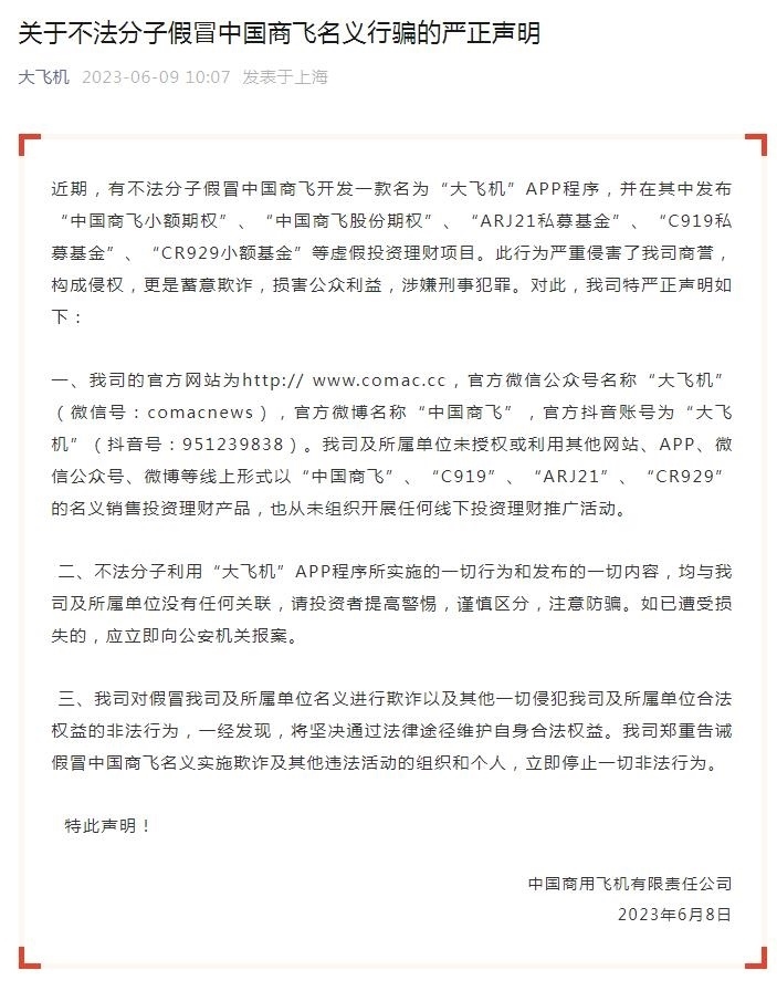 另?yè)?jù)“大飛機(jī)”微信公眾號(hào)6月9日發(fā)布的《關(guān)于不法分子假冒中國(guó)商飛名義行騙的嚴(yán)正聲明》,有不法分子假冒中國(guó)商飛開發(fā)一款名為“大飛機(jī)”APP程序,并在其中發(fā)布“中國(guó)商飛小額期權(quán)”、“中國(guó)商飛股份期權(quán)”、“ARJ21私募基金”、“C919私募基金”、“CR929小額基金”等虛假投資理財(cái)項(xiàng)目。