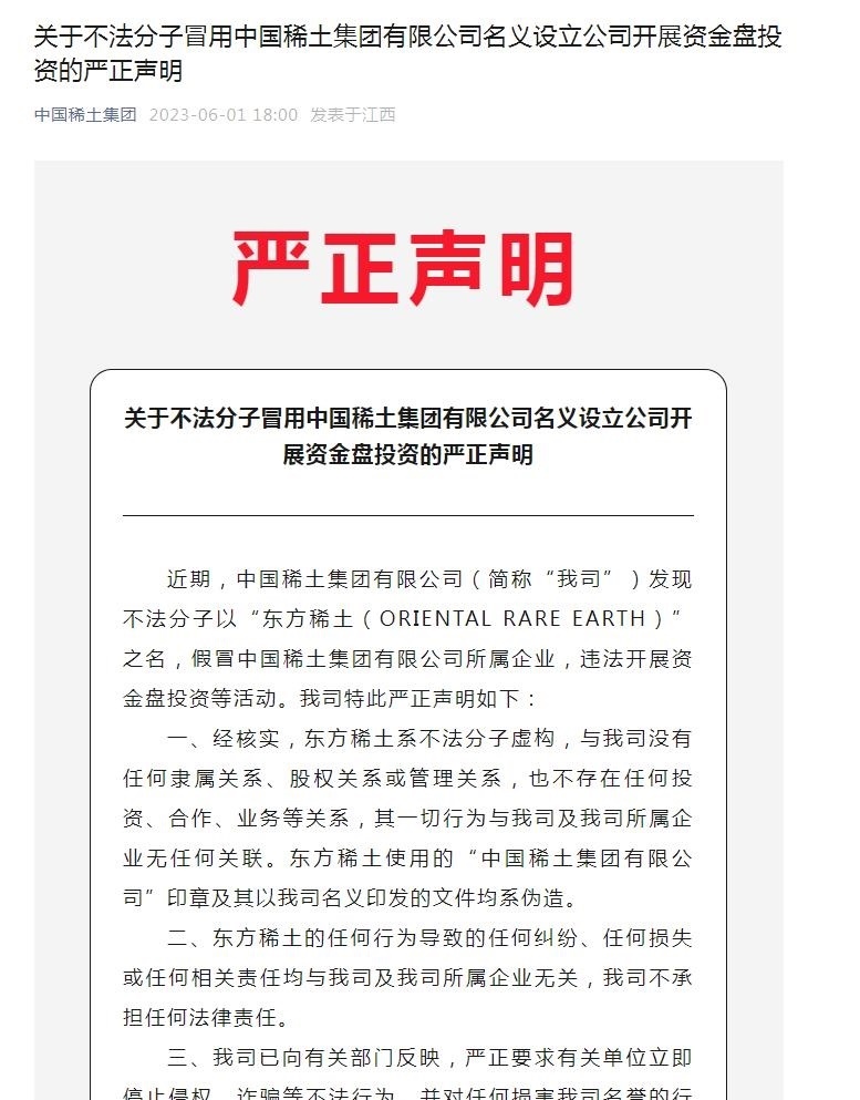 中國(guó)稀土表示,經(jīng)核實(shí),東方稀土系不法分子虛構(gòu),與公司沒有任何隸屬關(guān)系、股權(quán)關(guān)系或管理關(guān)系,也不存在任何投資、合作、業(yè)務(wù)等關(guān)系,其一切行為與公司及公司所屬企業(yè)無(wú)任何關(guān)聯(lián)。東方稀土使用的“中國(guó)稀土集團(tuán)有限公司”印章及其以我司名義印發(fā)的文件均系偽造。