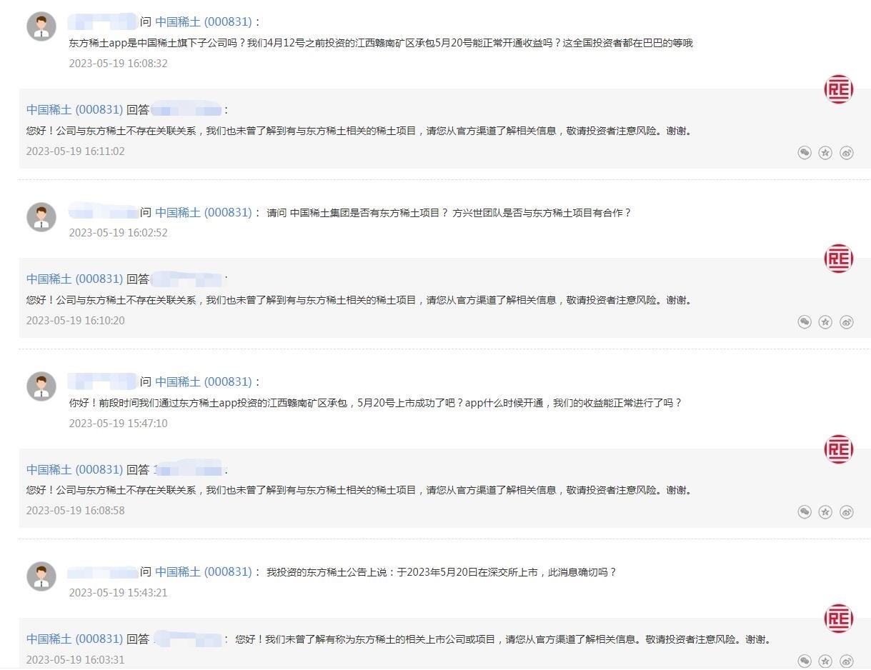 中新財(cái)經(jīng)注意到,有投資者曾在互動(dòng)平臺(tái)上向中國(guó)稀土詢問“東方稀土”相關(guān)信息,從提問內(nèi)容看,可能已有投資者被誤導(dǎo)受騙。比如,“東方稀土APP是中國(guó)稀土旗下子公司嗎?我們4月12號(hào)之前投資的江西贛南礦區(qū)承包5月20號(hào)能正常開通收益嗎?”“我投資的東方稀土公告上說:于2023年5月20曰在深交所上市,此消息確切嗎?”等等。