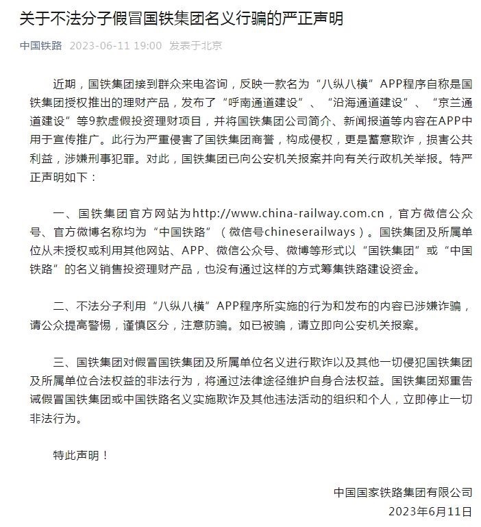 “中國(guó)鐵路”微信公眾號(hào)6月11日發(fā)布嚴(yán)正聲明稱,近期,國(guó)鐵集團(tuán)接到群眾來電咨詢,反映一款名為“八縱八橫”APP程序自稱是國(guó)鐵集團(tuán)授權(quán)推出的理財(cái)產(chǎn)品,發(fā)布了“呼南通道建設(shè)”、“沿海通道建設(shè)”、“京蘭通道建設(shè)”等9款虛假投資理財(cái)項(xiàng)目,并將國(guó)鐵集團(tuán)公司簡(jiǎn)介、新聞報(bào)道等內(nèi)容在APP中用于宣傳推廣。