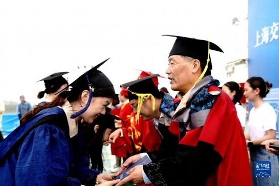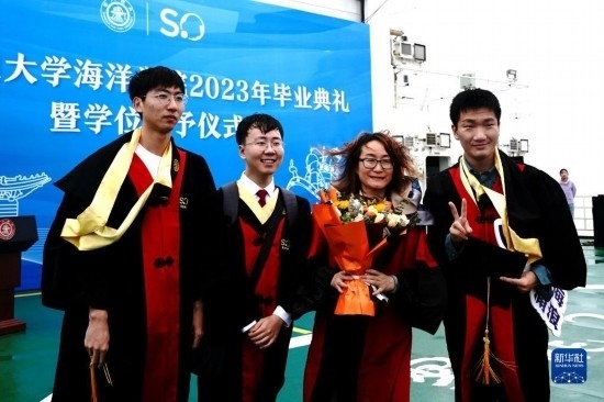 當(dāng)日,上海交通大學(xué)海洋學(xué)院2023年畢業(yè)典禮暨學(xué)位授予儀式在“雪龍2”號上舉行,70余名畢業(yè)生在甲板上與師長道別?!把?”號是我國自主建造的第一艘極地科學(xué)考察破冰船。