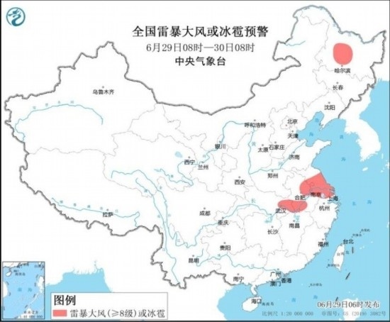 中央氣象臺(tái)6月29日06時(shí)繼續(xù)發(fā)布暴雨藍(lán)色預(yù)警和強(qiáng)對(duì)流天氣黃色預(yù)警:預(yù)計(jì),6月29日08時(shí)至30日08時(shí),黃淮南部、江淮、江漢中南部、江南北部、重慶東部以及黑龍江北部、內(nèi)蒙古東北部等地部分地區(qū)有大到暴雨,其中,湖北東部等地局地有大暴雨(100~150毫米)。上述部分地區(qū)伴有短時(shí)強(qiáng)降水(最大小時(shí)降雨量30~50毫米,局地可超過(guò)70毫米),黑龍江中部、安徽中南部、江蘇中南部、上海西北部、湖北東部等地的部分地區(qū)將有8~10級(jí)雷暴大風(fēng)或冰雹天氣,局地風(fēng)力11級(jí),江蘇中南部局地可能伴有龍卷(見圖1和圖2)。強(qiáng)對(duì)流的主要影響時(shí)段為今天午后至夜間。