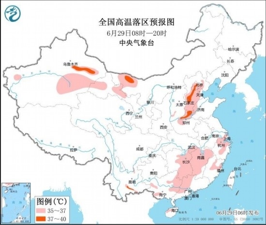 圖3 全國(guó)高溫落區(qū)預(yù)報(bào)圖(6月29日08時(shí)-20時(shí)) 圖自中央氣象臺(tái)網(wǎng)站