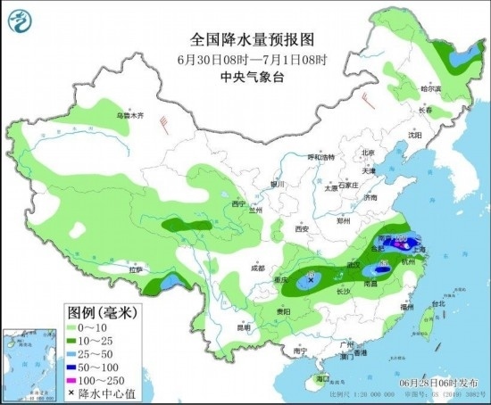 6月30日08時(shí)至7月1日08時(shí),黑龍江北部、西藏東南部、青海南部、江淮大部、江漢東部、江南北部、西南地區(qū)東部等地部分地區(qū)有中到大雨,其中,安徽中南部、江蘇南部、上海北部、江西北部等地部分地區(qū)有暴雨或大暴雨(100~150毫米)。內(nèi)蒙古中部部分地區(qū)有4~6級(jí)風(fēng),其中,新疆東部部分地區(qū)有6~7級(jí)風(fēng)(見圖5)。