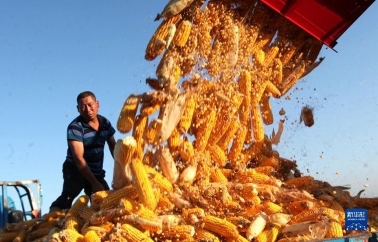9月14日,農(nóng)民駕駛農(nóng)機(jī)在河南省駐馬店市汝南縣羅店鎮(zhèn)袁莊村收獲成熟的玉米。