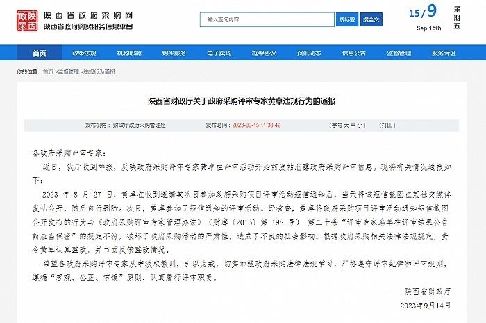 ·一名政府采購評(píng)審專家被舉報(bào)泄露評(píng)審信息,陜西省財(cái)政廳通報(bào)。