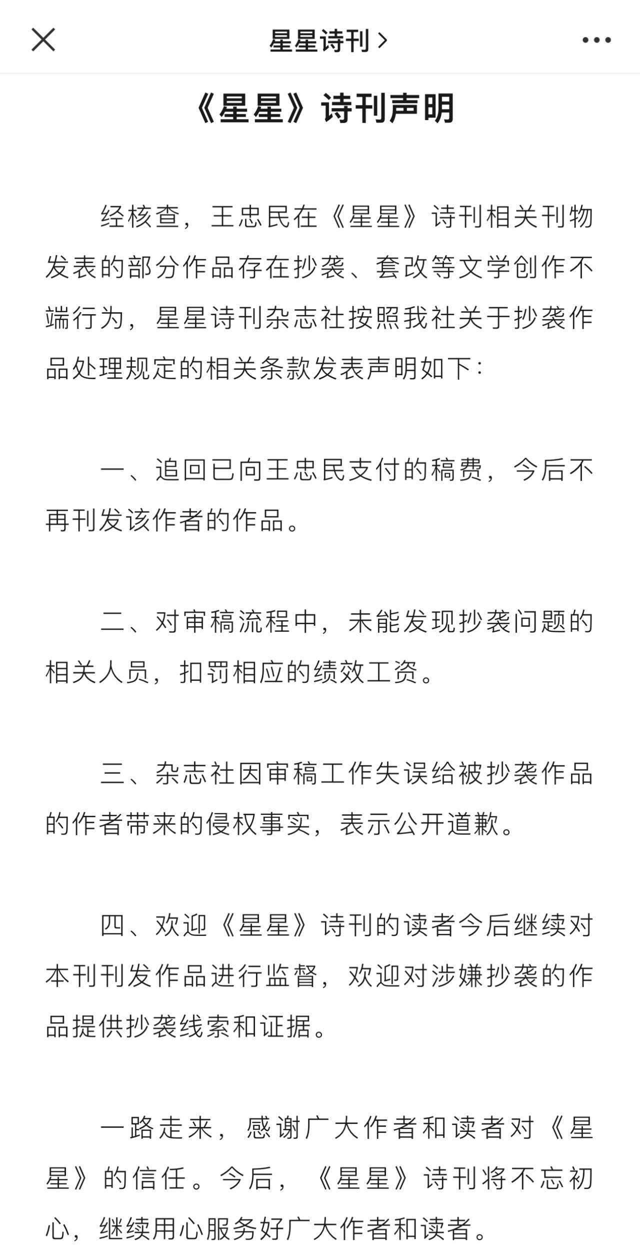 《星星》詩刊雜志社稱,按照該社關(guān)于抄襲作品處理規(guī)定的相關(guān)條款,追回已向王忠民支付的稿費,今后不再刊發(fā)該作者的作品;對審稿流程中,未能發(fā)現(xiàn)抄襲問題的相關(guān)人員,扣罰相應(yīng)的績效工資。