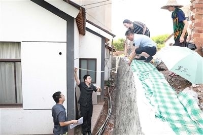 執(zhí)行干警確認(rèn)石磡墻高度。
