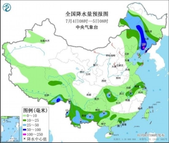 全國降水量預(yù)報(bào)圖(7月3日08時(shí)-4日08時(shí))。圖片來源:中央氣象臺網(wǎng)站