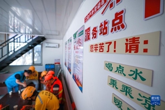 7月7日,在山東省榮成市觀海路東段一處戶外勞動(dòng)者“愛心驛站”,志愿者為環(huán)衛(wèi)工人、外賣配送員等戶外工作者沏茶、加水。