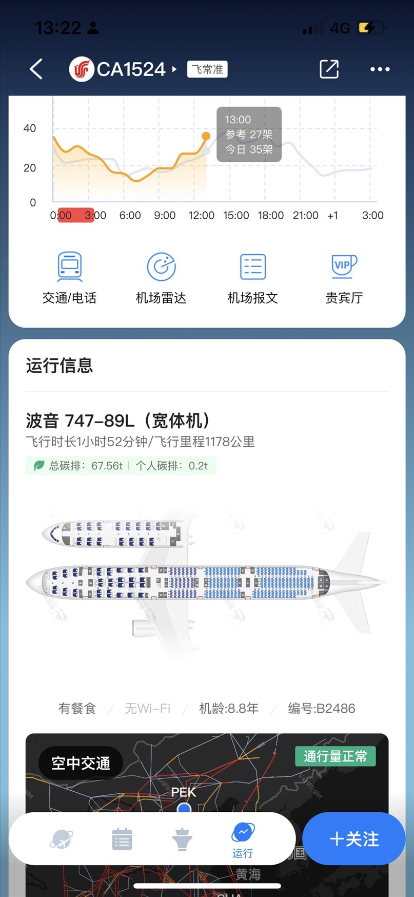7月11日國航CA1524航班執(zhí)飛機(jī)型為波音747-89L。 飛常準(zhǔn)截圖