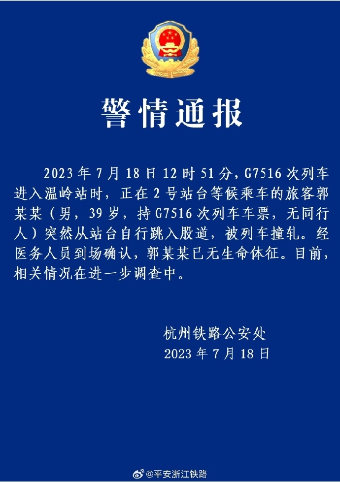 ·警方通報(bào):溫嶺跳下高鐵站臺(tái)男子已無(wú)生命體征。