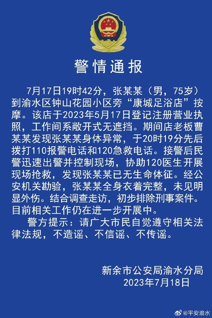 ·警方通報(bào)7旬男子按摩店內(nèi)死亡:其衣著完整未見(jiàn)明顯外傷,初步排除刑事案件。
