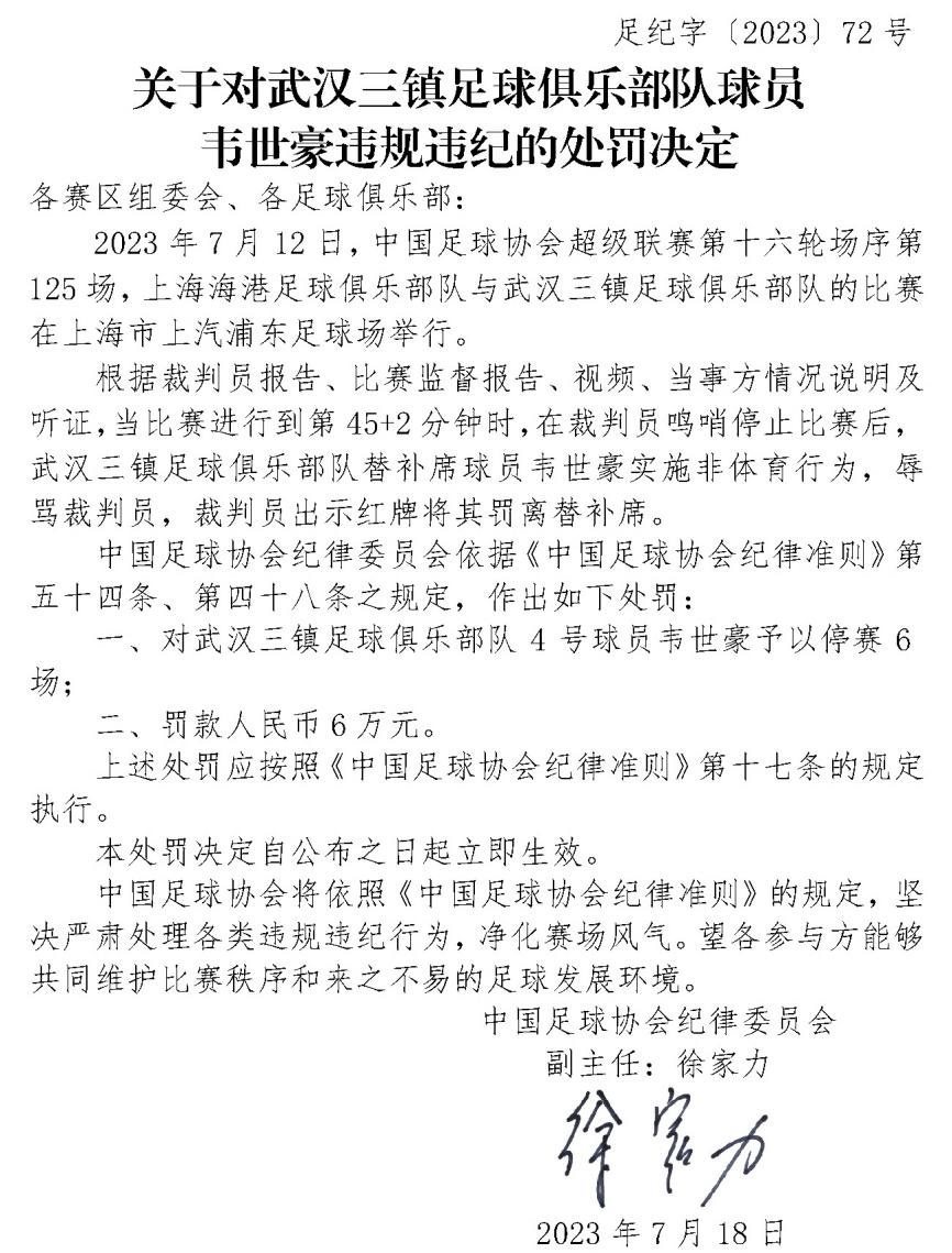 ·18日,中國(guó)足球協(xié)會(huì)紀(jì)律委員會(huì)發(fā)布重磅罰單,球員韋世豪辱罵裁判,被停賽6場(chǎng)罰款6萬(wàn)。