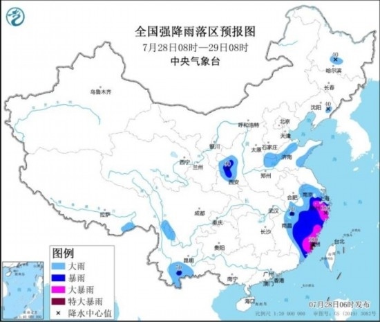 預(yù)計,7月28日08時至29日08時,江蘇南部、安徽南部、浙江、福建、江西東部以及甘肅東部、陜西中部、云南南部、河南北部、山東西北部和東南部等地的部分地區(qū)有大到暴雨,其中,浙江北部和東部、福建東部等地的部分地區(qū)有大暴雨,局地特大暴雨(250~280毫米)。上述部分地區(qū)伴有短時強降水(最大小時降雨量30~60毫米,局地可超過80毫米),局地有雷暴大風(fēng)等強對流天氣。中央氣象臺7月28日06時繼續(xù)發(fā)布暴雨橙色預(yù)警。