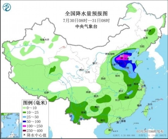 7月30日08時至31日08時,華北中東部、黃淮東部、江淮中東部、江南北部、西南地區(qū)東部和南部等地的部分地區(qū)有中到大雨,其中,北京南部、天津、河北大部、山東中西部等地部分地區(qū)有暴雨或大暴雨,河北中部等地局地特大暴雨(250~280毫米)。新疆東部、河北南部、浙江北部等地部分地區(qū)有4~6級風(fēng)。