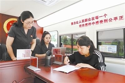 圖③:干警在“車載便民法庭”對(duì)調(diào)解協(xié)議現(xiàn)場(chǎng)進(jìn)行司法確認(rèn)。
