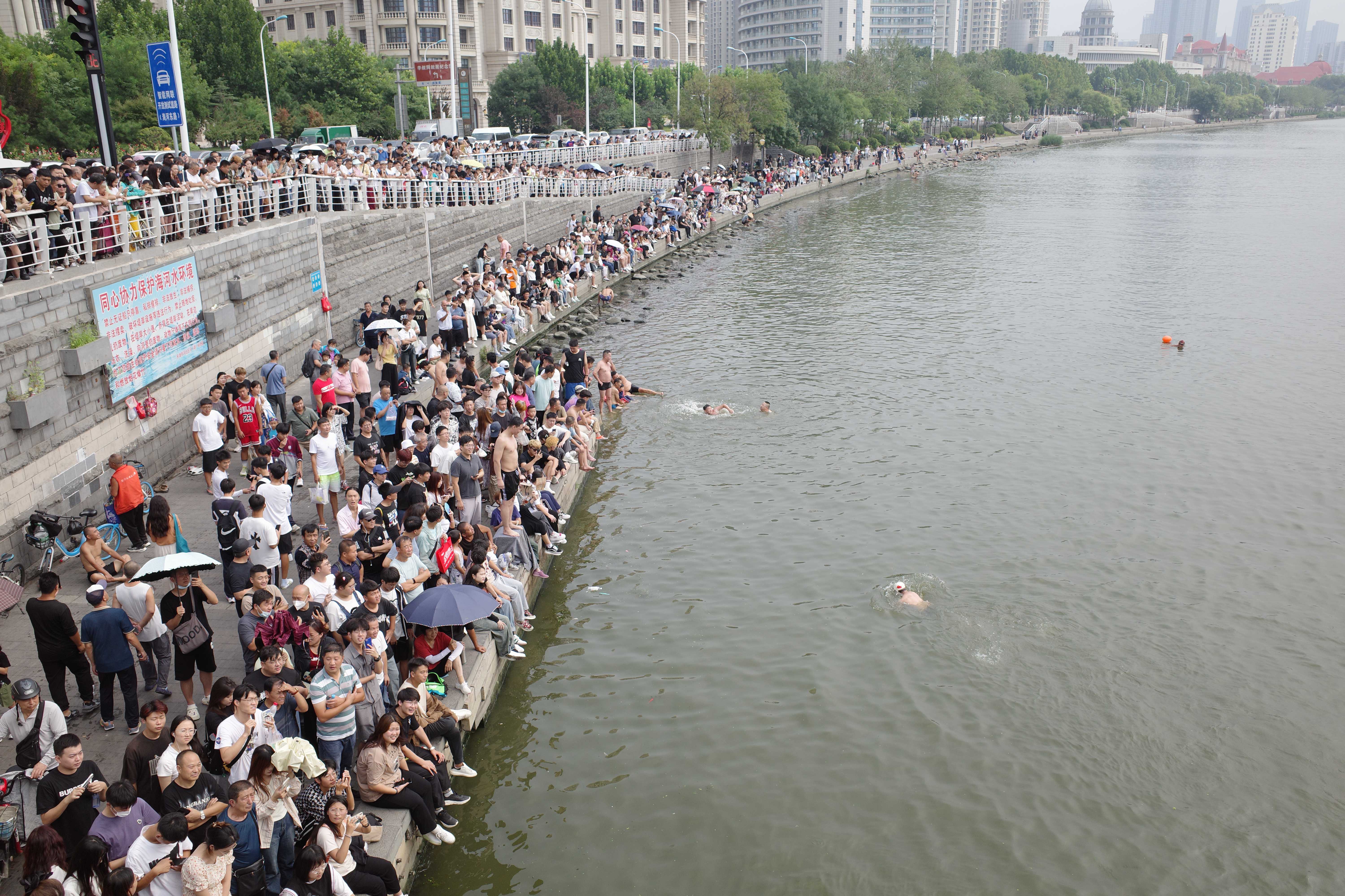 ▲海河邊圍觀跳水的人群