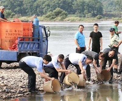 弋陽(yáng)法院法官聯(lián)合相關(guān)部門開(kāi)展增殖放流活動(dòng)。