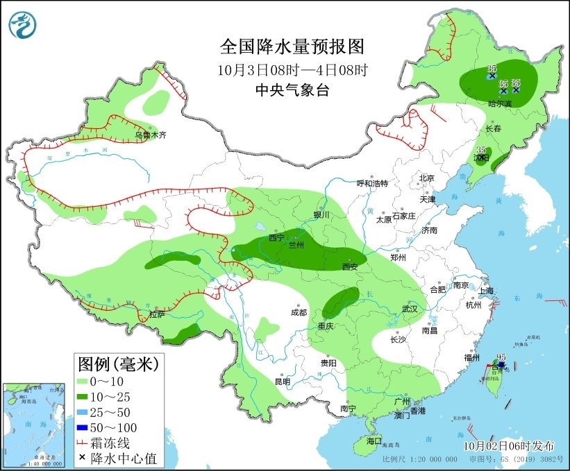 10月3日08時至4日08時,黑龍江西南部、遼寧東部、西藏東南部、青海東部、甘肅東南部、陜西中南部、重慶北部以及臺灣島北部等地部分地區(qū)有中到大雨,其中,臺灣島北部和東部等地部分地區(qū)有暴雨(50~95毫米)。內(nèi)蒙古東南部、西藏北部等地部分地區(qū)有4~6級風(fēng)。渤海、渤海海峽、黃海大部、東海北部將有6~7級風(fēng)、陣風(fēng)8級,東海西南部海域風(fēng)力將有7~8級風(fēng)、陣風(fēng)9級。臺灣以東洋面將有7~8級轉(zhuǎn)9~10級風(fēng)、陣風(fēng)9級轉(zhuǎn)11級(見圖2)。