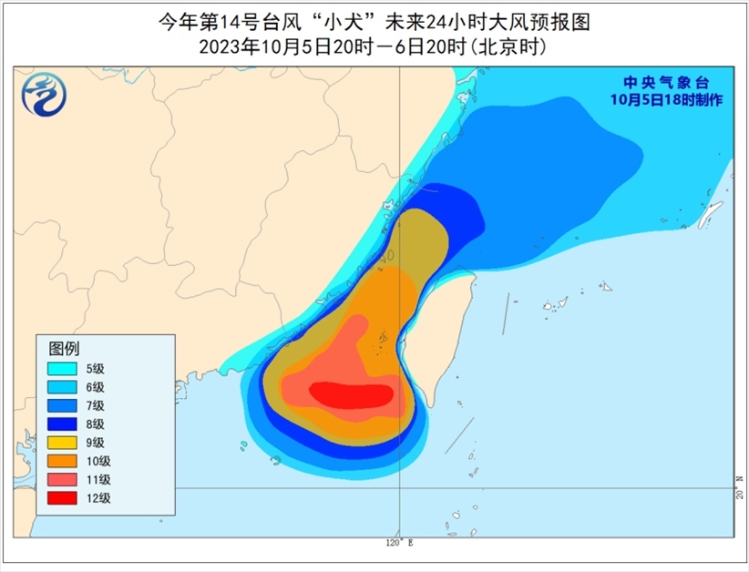 大風(fēng)預(yù)報:5日20時至6日20時,東海大部及釣魚島附近海域、巴士海峽西北部、臺灣海峽、南海東北部以及浙江沿海、福建沿海、廣東東部沿海、臺灣島北部沿海將有6-8級、陣風(fēng)9-10級的大風(fēng),其中巴士海峽西北部、臺灣海峽、南海東北部等地部分海域?qū)⒂?-10級、陣風(fēng)11-13級的大風(fēng),“小犬”中心經(jīng)過的附近海面風(fēng)力有11-13級,陣風(fēng)14-15級。