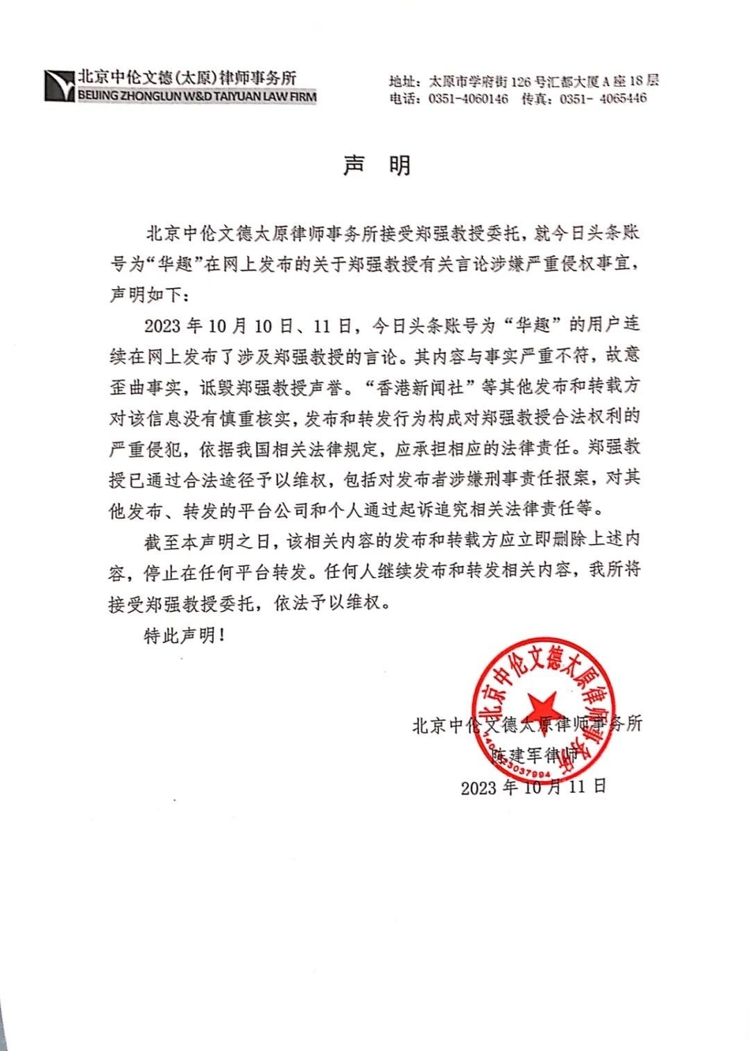 同時,北京中倫文德太原律師事務所接受鄭強教授委托發(fā)表聲明,稱將依法予以維權。