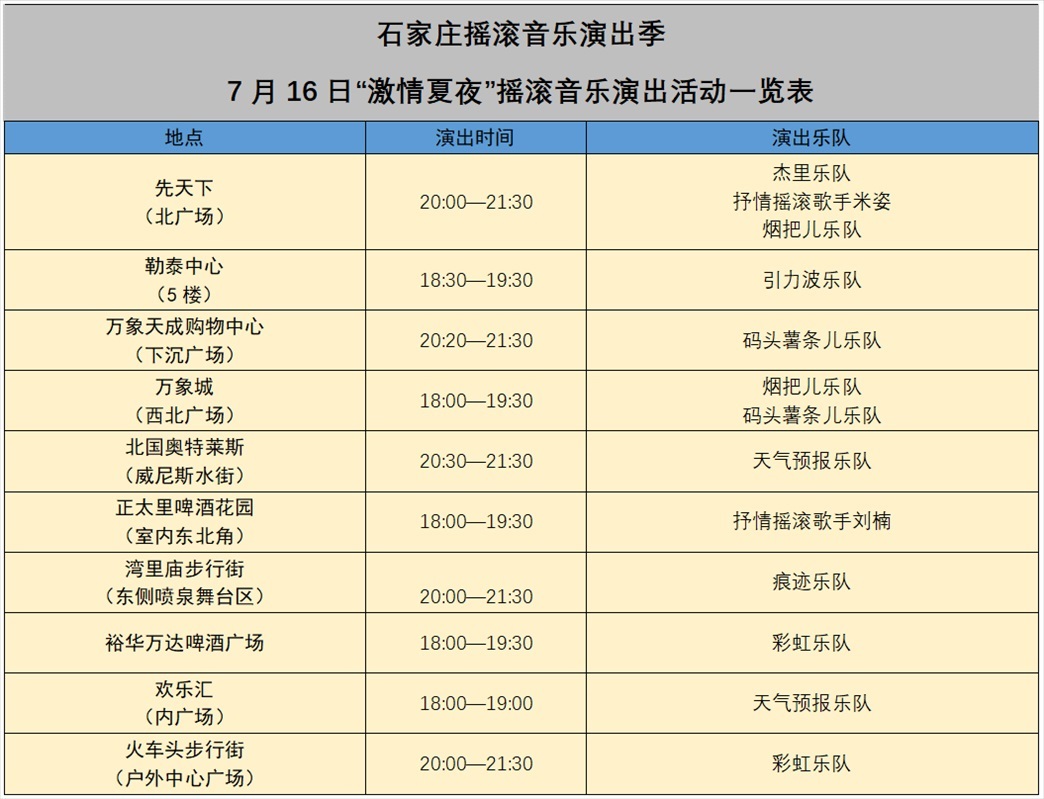 當?shù)孛襟w早前報道稱,9月16日至24日,由河北省商務(wù)廳、石家莊市人民政府聯(lián)合主辦的河北·澳門美食音樂消費節(jié)暨河北金秋消費季活動在石家莊舉辦。活動共包含特色美食節(jié)、音樂休閑節(jié)、激情購物節(jié)三個板塊。其中,音樂休閑節(jié)于每天18時30分至22時30分在石家莊正太廣場舉辦。十余位歌手、6支樂隊帶來精彩的音樂演出,豐富市民游客文化體驗,演出曲目風格包含搖滾、民謠、爵士、抒情等。
