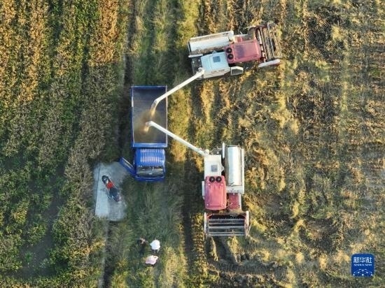 10月18日,湖南省衡陽市衡山縣白果鎮(zhèn),農(nóng)民在收割晚稻(無人機照片)。