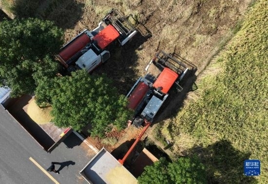 10月18日,湖南省衡陽市衡山縣白果鎮(zhèn),農(nóng)機手駕駛收割機搶收晚稻(無人機照片)。