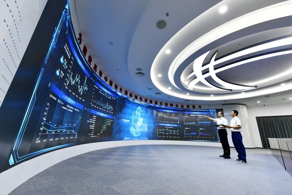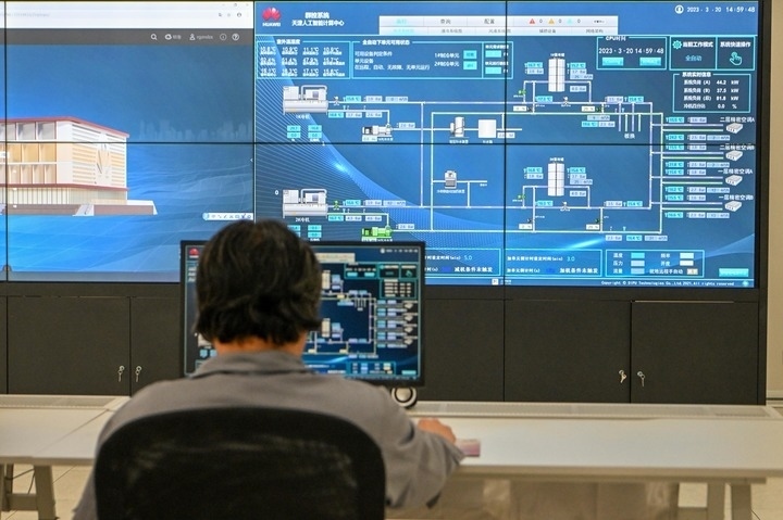 在天津市人工智能計(jì)算中心中控室,技術(shù)人員在監(jiān)控設(shè)備運(yùn)行情況。新華社記者 孫凡越 攝